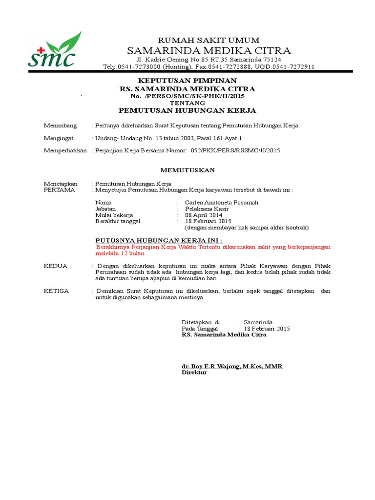 Contoh Surat Keputusan Kerja - Contoh Surat Keputusan Pemberhentian Kerja Karyawan Cute766 - Karena bila kita ingin bekerja kita harus membuat surat lamaran kerja dan dikirimkan ke perusahaan yang membuka lowongan pekerjaan.. Contoh surat lamaran kerja yang ditulis tangan. Surat keputusan (sk) menjadi penanda akhir proses suatu masalah agar suatu masalah dapat teratasi dan bisa memberikan pilihan (alternatif). Urusan keluarga yang kerap membuat kita untuk membuat surat izin adalah adanya anggota keluarga yang sakit, meninggal dunia, menikah, atau melahirkan yang untuk mengetahui bagaimana membuat surat izin tidak masuk kerja bagi pegawai negeri sipil, silahkan lihat contohnya di bawah ini! Surat keputusan no:29/sk/hrd/21 tentang pengangkatan karyawan. Saya adalah alumni universitas kristen duta wacana yogyakarta fakultas ekonomi jurusan manajemen yang lulus pada tanggal 22.